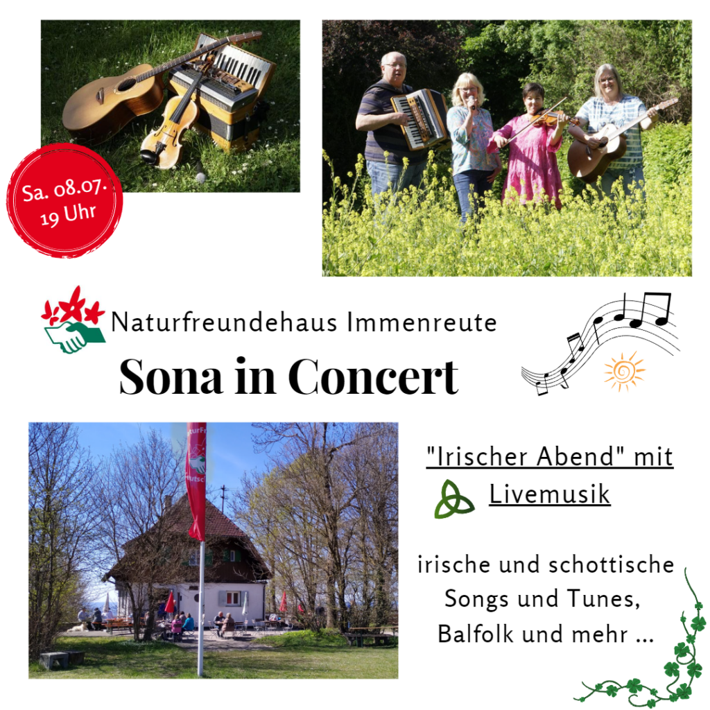 Am Samstag, 8. Juli 2023 spielt die Band „SONA“ ab 19 Uhr auf der Immenreute! Die vier Musiker*innen sorgen mit ihrer spannenden Mischung aus irischen und schottischen Songs,Stücken aus dem Balfolk und ihren Lieblingsmelodien aus ganz Europa für wippende Füße und jede Menge guter Laune.