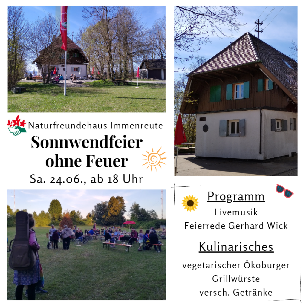 Eine Sonnwendfeier ohne Feuer – angesichts der anhaltenden Hitzewelle und der damit einhergehenden Dürre wäre es unverantwortlich die Sommersonnenwende mit einem traditionellen Feuer zu begrüßen. Wir nehmen die Zeichen der heran rollenden Klimakatastrophe ernst und denken um: Statt eines Feuers erwarten euch auf der Immenreute am Samstag, den 24. Juni ab 18 Uhr Livemusik, leckere Ökoburger, Grillwürste und jede Menge kühler Getränke. Seid herzlich eingeladen mit uns die Sommersonnwende zu feiern!